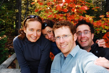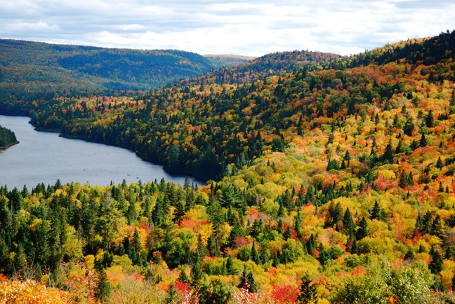 had just kayaked… steely sky seemed to lend even more fire to the changing leaves stretching out far below our vantage point. Lucky for us we had an accomplished arborialist along on our expedition. Along the trail, Nathalie was able to point out the elusive Érable de la Mauricie, so-called, in her words, “Parce que ca mord ici,” her finger pointing out small bite-marks where a chlorophyll-addicted bug had taken some bites of the leaves.