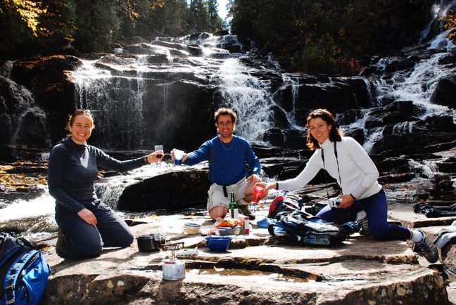 pregnancy, but was not ready to announce to anybody, so she could have none of the unpasteurized or alcoholic fare, or even patés, and proceeded to pretend that there were other possible very good reasons why she wouldn’t want to chow down on such an amazing spread. When Isabelle tried to salvage some of the luxury experience for herself by asking innocently if one of the cheeses was pasteurized, Nat immediately quipped, “Why... are you pregnant?” Ba-dum-bum. Not sure if they knew then, although it’s a moot point now. However, I have to say I took one for the team, when Isabelle surreptitiously switched her nearly full wine glass for my nearly empty one while Stéph and Nat went off to take a picture—the walk back up beside the falls my legs felt considerably heavier than usual. In any case, the falls made for a thundering backdrop for lunch, with sunlight streaming down and warming our flat space on the rocks, with the river flowing around us on both sides. This one was definitely up there for us, in the pantheon of lunch spots on hiking excursions, for the setting as well as the company.